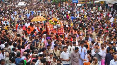 सीएम हेलीकॉप्टर से बरसाते रहे पुष्प, भक्त झूम उठे