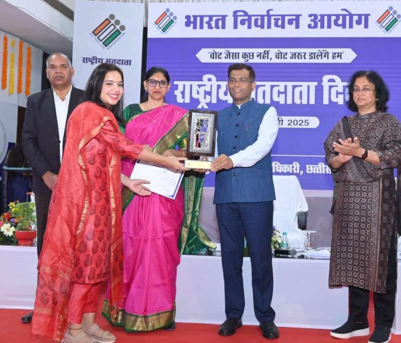 मतदाता दिवस के अवसर पर उपस्थित सभी लोगों को मतदाता शपथ दिलाई गई। कार्यक्रम में नव मतदाताओं, सर्विस वोटरों और निर्वाचन कार्यों में उल्लेखनीय योगदान देने वाले अधिकारियों-कर्मचारियों को सम्मानित किया गया। रायगढ़ कलेक्टर कार्तिकेय गोयल को प्रदेश में लोकसभा निर्वाचन 2024 में सर्वाधिक 81.66 प्रतिशत मतदान कराए जाने, दुर्ग कलेक्टर सुऋचा प्रकाश चौधरी को शहरी क्षेत्र होने के बावजूद विगत लोकसभा चुनाव की तुलना में वर्ष 2024 में लोकसभा निर्वाचन में मतदान प्रतिशत में 2.48 प्रतिशत वृद्धि, दंतेवाड़ा कलेक्टर मयंक चतुर्वेदी को धुर नक्सल प्रभावित क्षेत्र होते हुए भी विगत लोकसभा निर्वाचन की तुलना में लोकसभा निर्वाचन 2024 में 10.39 प्रतिशत वृद्धि के लिए उत्कृष्ट जिला निर्वाचन अधिकारी के रूप में सम्मानित किया गया। रायपुर कलेक्टर गौरव कुमार सिंह को लोकसभा निर्वाचन 2024 के दौरान मतदान दलों का प्रशिक्षण कार्य उत्कृष्ट तरीके से संपन्न कराने, राजनांदगांव जिला पंचायत की मुख्य कार्यपालन अधिकारी सुसुरुचि सिंह को गुणवत्ता पूर्ण स्वीप गतिविधियां आयोजित करने और मुंगेली जिले के जिला पंचायत मुख्य कार्यपालन अधिकारी प्रभाकर पांडे को प्रवासी मजदूरों को मतदान के लिए प्रेरित करने संबंधी स्वीप गतिविधियों के लिए स्पेशल अवार्ड से सम्मानित किया गया।
