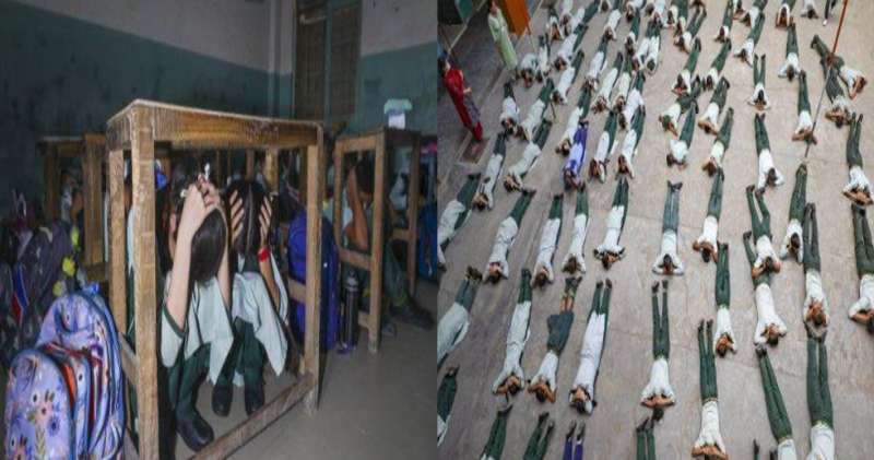 जम्मू के एक स्कूल में छात्रों को मॉक ड्रिल अभ्यास के दौरान किसी भी स्थिति से निपटने के लिए प्रशिक्षित किया जा रहा है।