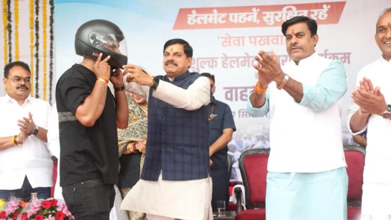 सीएम मोहन यादव ने खुद पहनाया हेलमेट और जनता को जागरूक किया